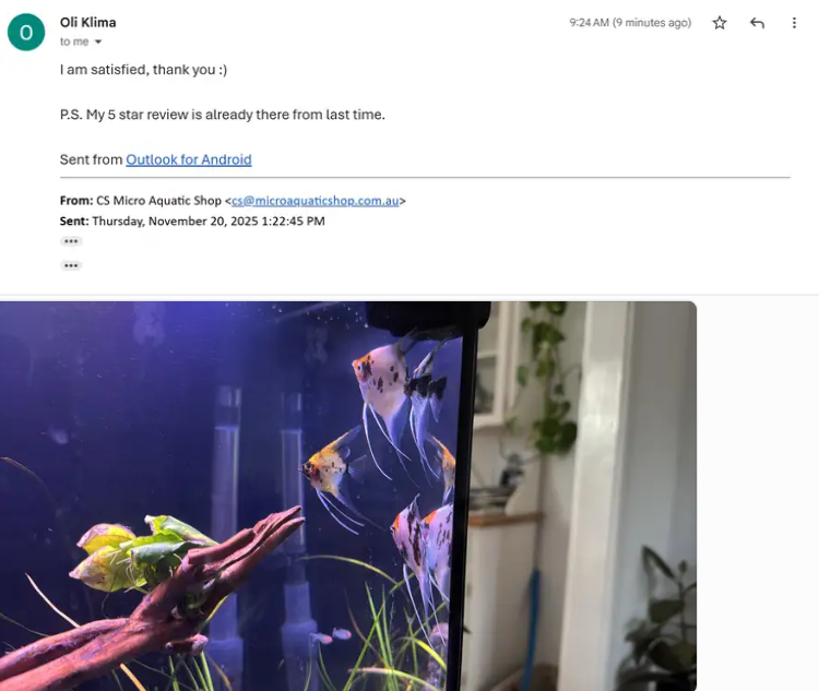 Super fast delivery. Fish and shrimp (5 platys, 10 neon tetras, 6 ember tetras, 25 mixed shrimp) all arrived happy, healthy and full of energy. Great communication, good prices. Will definitely be using Micro Aquatics again! Thank you