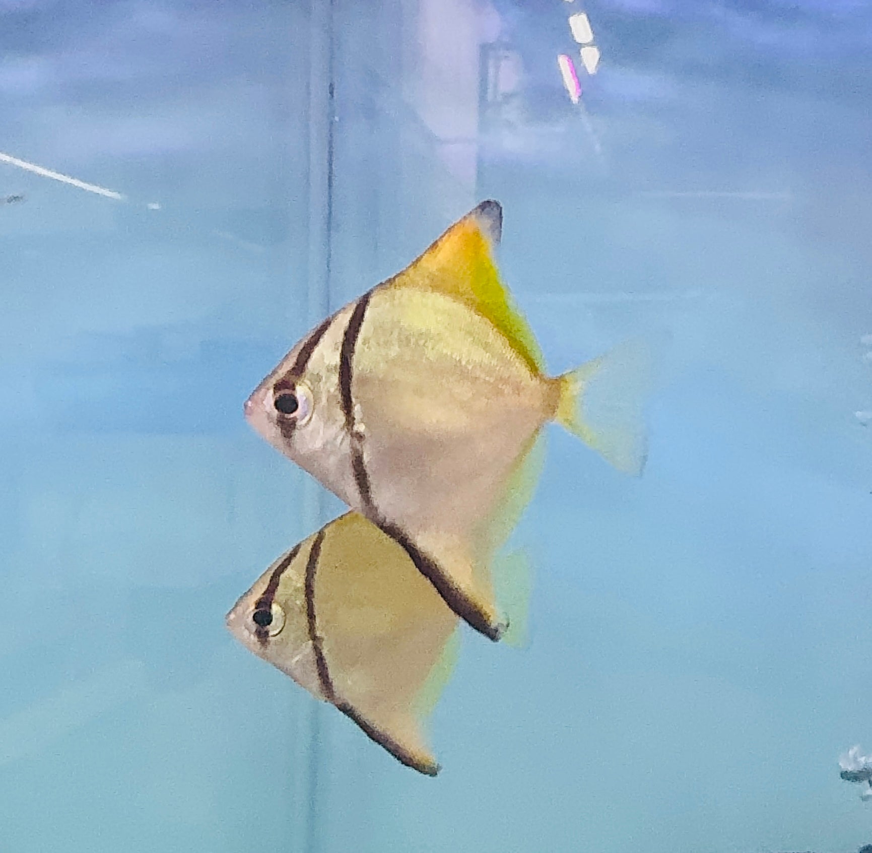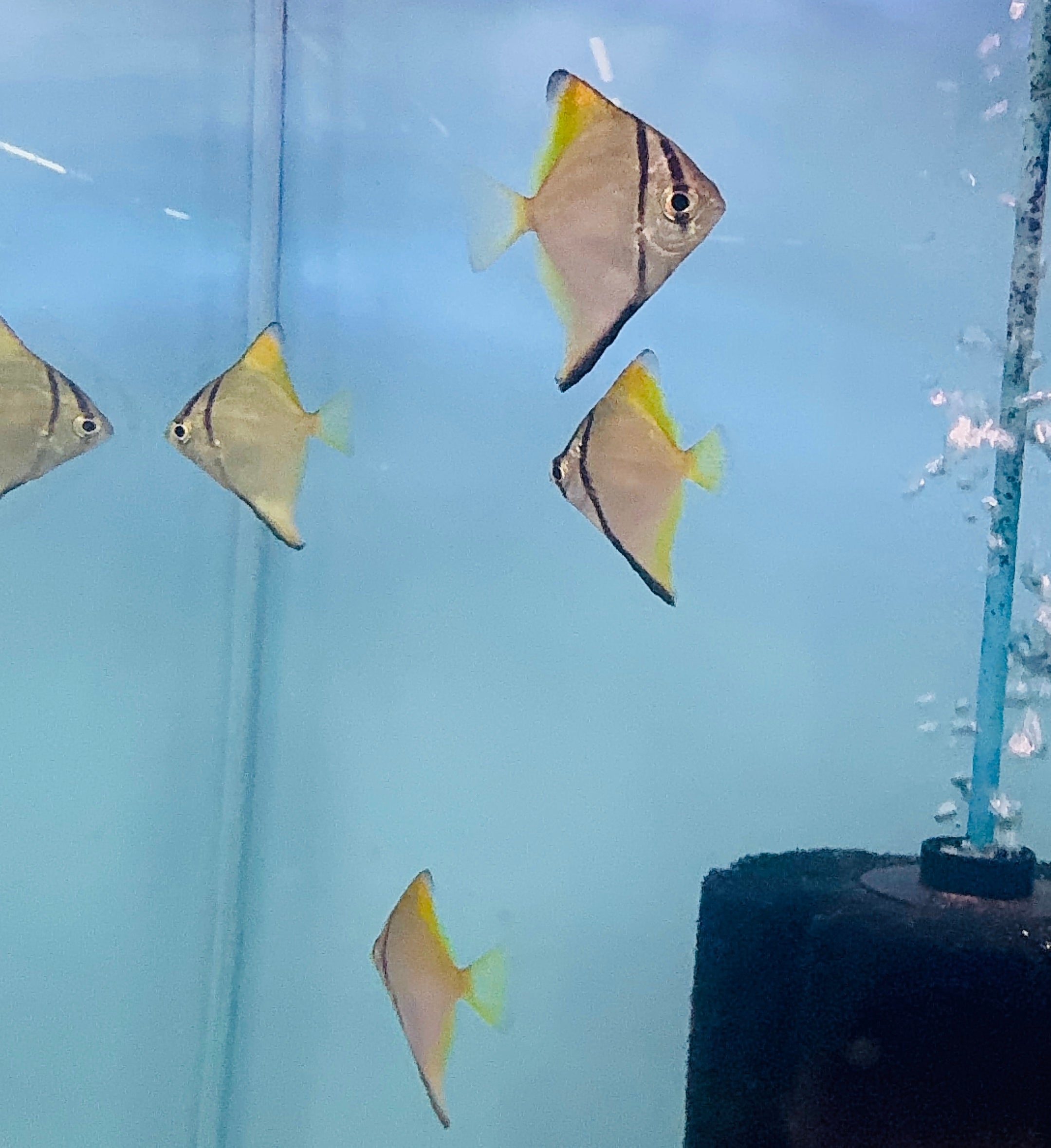 Mono Argenteus has a laterally compressed, diamond-shaped silver body with yellowish hues on the fins and head. They are highly active schooling fish that require a large tank and plenty of swimming space.