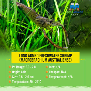If you're into aquarium hobbyist or just starting, think about getting the Long Armed Freshwater Shrimp. It's tough, colourful, and fun to watch. It's a great pick for showing off an Australian native species in your freshwater ecosystem. Let this amazing crustacean be the star of your aquarium journey.