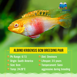 Kribensis are one of the most popular dwarf cichlids for community aquaria. Both sexes are very colourful, particularly the females when they are in breeding condition. They readily breed and raise fry in a planted community aquarium, laying their eggs in a cave-like shelter such as under a rock or driftwood. Native to West Africa, males grow to about 9cm, females to about 7cm.
