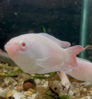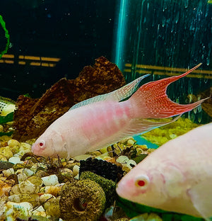 The fork tailed paradisefish (often just called paradise fish, paradise-fish, paradisefish), or paradise gourami (Macropodus opercularis) is a species of gourami found in most types of fresh water in East Asia, ranging from the Korean Peninsula to northern Vietnam.[3] This species can reach a standard length of 6.7 cm (2+5⁄8 in), though most are only about 5.5 cm (2+3⁄16 in).[2] Paradise gouramis were one of the first ornamental fishavailable to western aquarium keepers,[3][4] having been imported 1869 to France by the French aquarium fish importer Pierre Carbonnier in Paris. The paradise fish is one of the more aggressive members of its family. It is more aggressive than the three spot gourami, yet less pugnacious in nature than the less commonly kept combtail.
