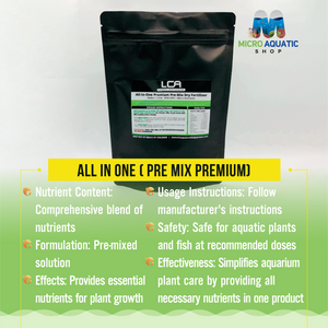 LCA's All in-One Premium Pre Mix Fertiliser is a super concentrated solution that supplies all the necessary micro and macro nutrients to ensure that your plants grow and develop in a healthy way. It has high concentration levels of Iron (Fe) in DTPA form which means it is specially formulated for tanks with a Ph level of up to 7.5 Full 3x per week dosing provides enough Nitrogen, Phosphorus, Potassium , Iron, and other important key trace elements for even the most demanding tanks.