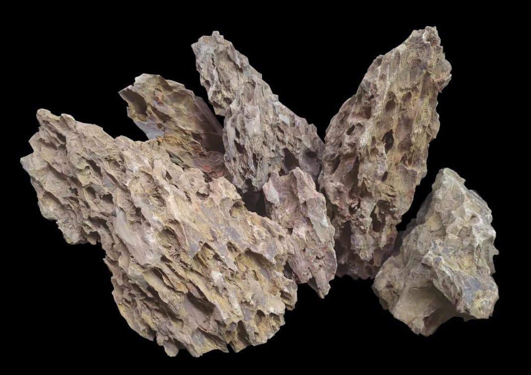 Dragon stone is an aquascaping stone made highly popular with the work of Takashi Amano. The stone is quite light for its size due the a large number of holes and crevices which gives the stone its telltale look. The rough surface as well as nooks and crannies that this creates also makes dragon stone popular for the ease which epiphatic plants can anchor and grow on its surface.
