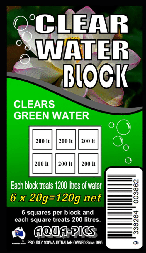 Clears green matter for a sparkling clear aquarium or pond. Clear Water Block has a slow release delivery system that helps to condition the water and clear the unsightly green matter in your aquarium or pond. When used strictly as directed, it is harmless to fish, plants and filter systems. Each block has 6 squares and each square treats 200 litres of water. 1 block of 6 squares treats 1,200 litres of water.