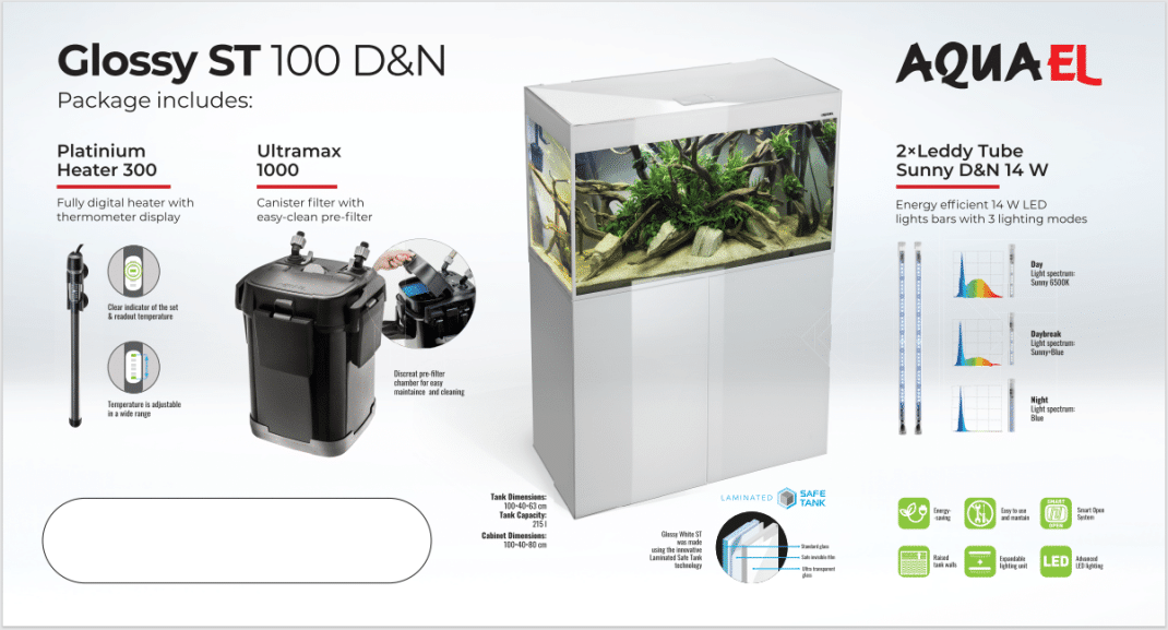 The Aquael Glossy 100 Package is a mid-sized aquarium setup that balances aesthetics, functionality, and performance, making it a versatile choice for a variety of aquatic environments.
