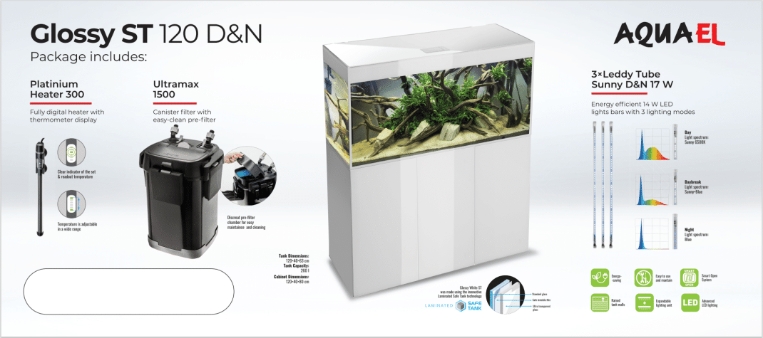 The Aquael Glossy 120 Package is an impressive and well-rounded aquarium setup that offers both substantial space and powerful equipment, making it ideal for a wide range of aquatic environments, including densely planted tanks or larger fish communities.