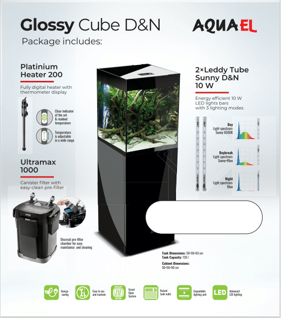 The Aquael Glossy Cube Package is a stylish and modern aquarium setup designed for both aesthetics and functionality.