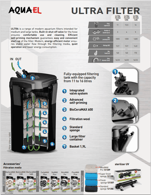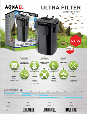 The Aquael Ultra Canister Filters in the 900, 1200, and 1400 range offer powerful filtration with slightly different capacities for aquariums of varying sizes. These models are designed to provide strong water flow, effective filtration, and low energy consumption. Here's an in-depth look at each model: