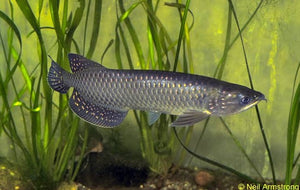 Like all Scleropages, S. leichardti is a long-bodied fish with large scales, large pectoral fins, and small paired barbels on its lower jaw. Each scale on its dark coloured body has a red or pink spot; this feature distinguishes it from S. jardinii, which has several reddish spots on each scale in a crescent shape. S. leichardti is a slimmer fish than other Scleropages; a 90 centimetres (35 in) fish was weighed at only 4 kilograms (8.8 lb), compared to 17.2 kilograms (38 lb), for a S. jardinii of similar length. The depth of its body is 23-25% of its Standard Length, and it has fewer fin rays than S. jardinii. It is a popular aquarium fish, although it will eat other fish, shrimp, yabbies etc., that are in the tank.