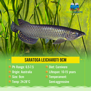 The southern saratoga (Scleropages leichardti), also known as the spotted bonytongue, spotted saratoga, or simply saratoga, is a freshwater bony fish native to Australia. It belongs to the subfamily Osteoglossinae, or arowanas, a primitive group of teleosts. Like all arowanas, it is a carnivorous mouthbrooder. Along with the gulf saratoga (Scleropages jardinii), the saratoga is also known as the Australian arowana (mainly by non-Australian aquarists) and barramundi, although the latter name is nowadays reserved in Australia for the unrelated Lates calcarifer.