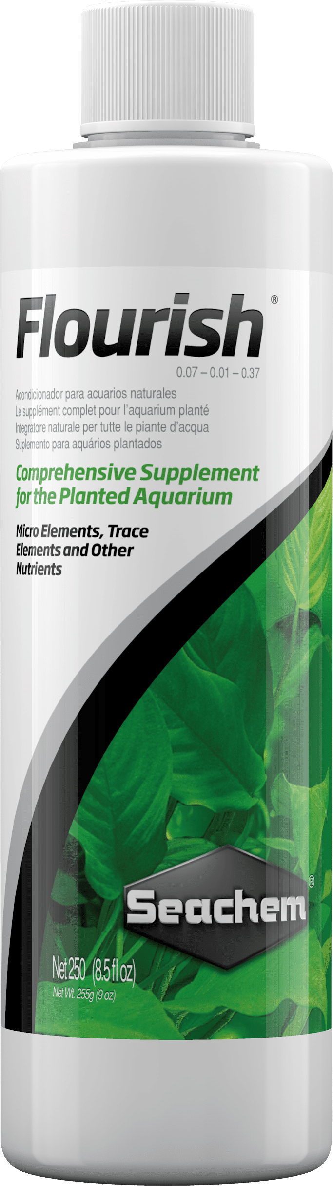 Seachem Flourish is a comprehensive plant supplement designed for freshwater aquariums, providing essential nutrients for healthy aquatic plant growth. It contains a blend of trace elements, vitamins, and amino acids, including iron, manganese, calcium, magnesium, and potassium, that are critical for maintaining vibrant and healthy plants. Flourish is ideal for aquariums with medium to high plant density, promoting overall plant development and improving leaf color and vitality.