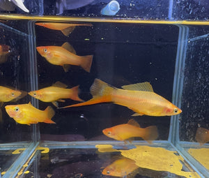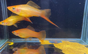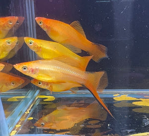 Telling male from female Gold Neon Swordtails is easy. Males have a long, sword-like tail fin. Females have a rounded, triangular tail fin.